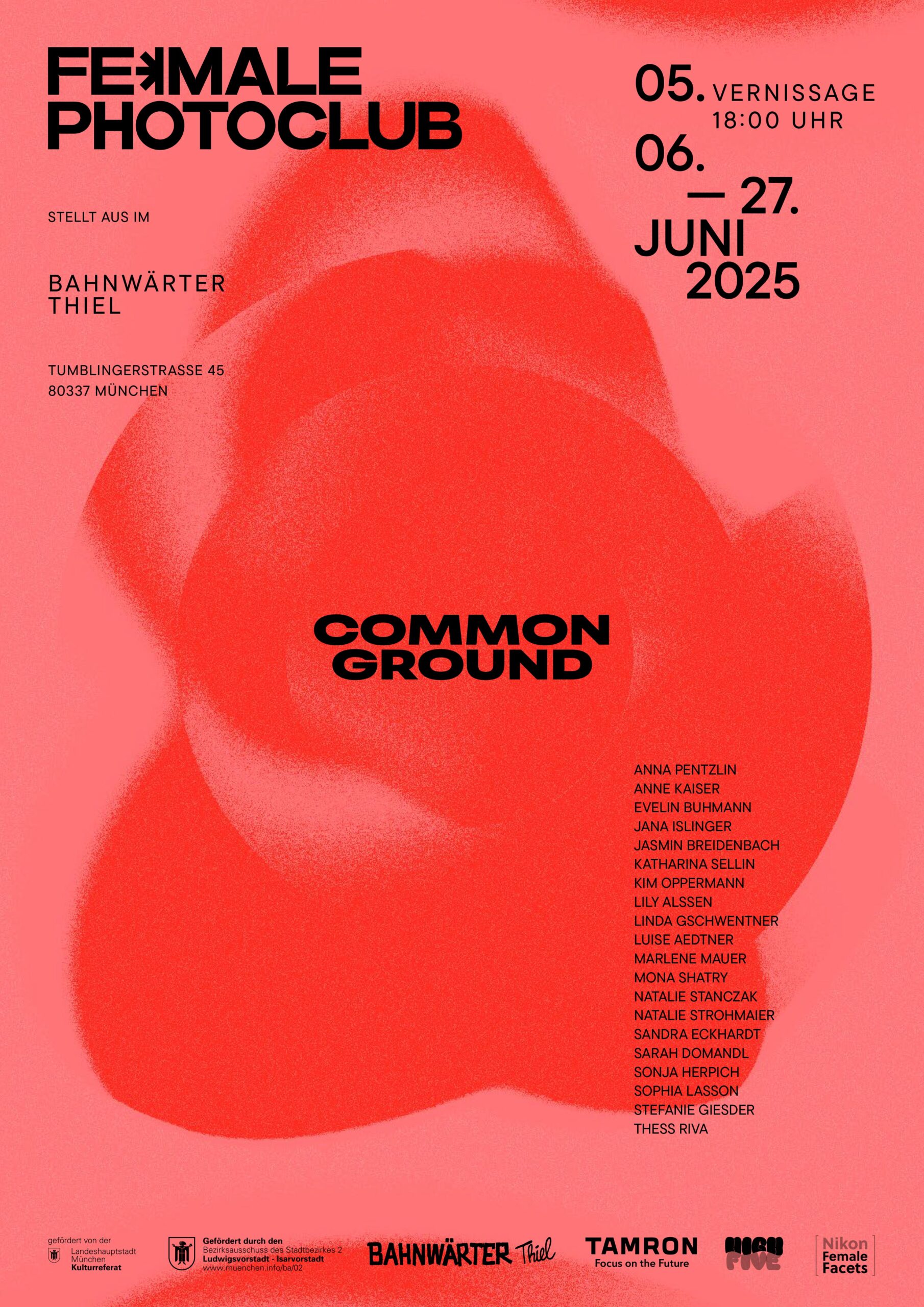 In der Ausstellung „Common Ground“, die vom 5. bis 27. Juni 2025 auf dem Gelände des Bahnwärter Thiel zu sehen ist, werfen 20 Fotografinnen des Female Photoclub München kontroverse gesellschaftliche Fragen auf. Sie alle haben sich in Einzelbildern oder Serien auf unterschiedlichste Art mit dem Ausstellungsthema auseinandergesetzt und es auf ihre Weise interpretiert – mal aufwühlend, mal berührend, mal provokant. Ihre Fotografien werden in großformatigen Prints und Plakaten im öffentlichen Raum auf dem Gelände des Kulturzentrums ausgestellt.