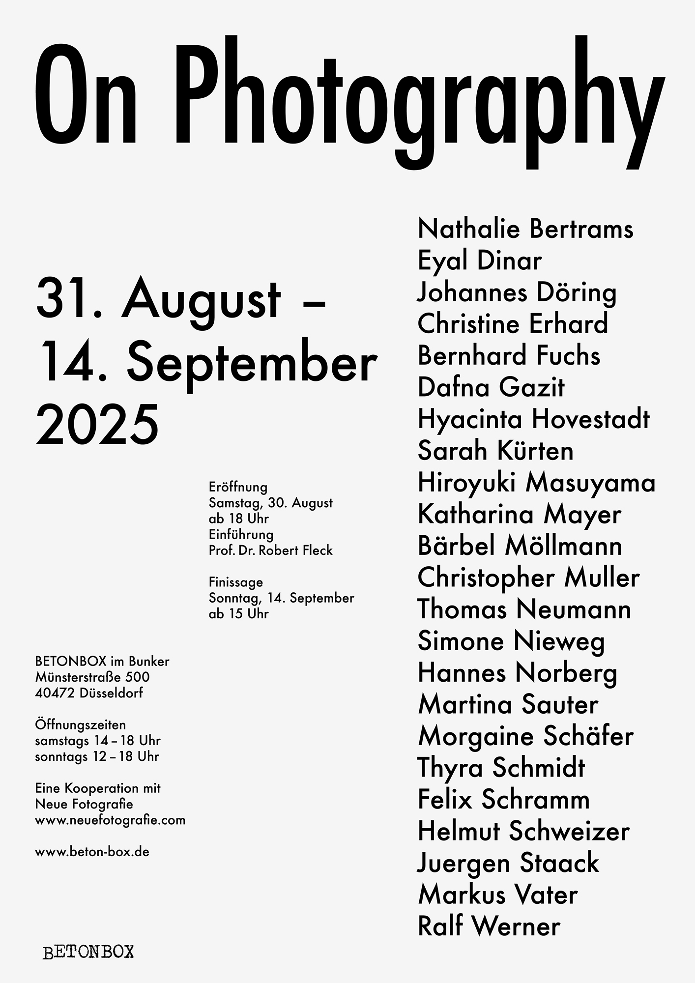 Fotografien von Helga und Victor von Brauchitsch Gelatinesilberabzüge 1958 - 2005 GESPRÄCH / TALK Dr. Boris von Brauchitsch 30. August 17 Uhr / 5 pm AUSSTELLUNG / EXHIBITION 30. August-11. Oktober 2025 Besuch bitte nach Vereinbarung / visits by appointment In einer Zeit der ständigen Bewegung, der permanenten Reizüberflutung und der digitalen […]